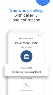 உங்களுக்கு யார் அழைக்கிறார்கள் என்பதை "Phone app" தெளிவாகத் தெரிவிக்கிறது. Google-ன் விரிவான அழைப்பாளர் அடையாளப் பதிவு மூலம், வணிக நிறுவனங்கள் உங்களைத் தொடர்புகொள்ளும்போது அவற்றின் பெயரை நீங்கள் உடனடியாக அறிந்து கொள்ளலாம். இதனால், தயக்கமின்றி நம்பிக்கையுடன் அழைப்பை ஏற்கலாம். மேலும், அறிந்திராத எண்களிலிருந்து வரும் அழைப்புகளை 'அழைப்புத் திரையிடல்' அம்சம் மூலம் தீர்வு காண்கிறது. இந்த அம்சம், கண்டறியப்பட்ட ஸ்பேம் அழைப்பாளர்களை உங்களுக்கு எந்த இடையூறும் இல்லாமல் தானாகவே வடிகட்டுகிறது. நீங்கள் அழைப்பை எடுப்பதற்கு முன்பே, உங்களுக்குத் தெரியாத அழைப்பாளர் பற்றிய கூடுதல் தகவல்களைப் பெற இது உதவுகிறது.